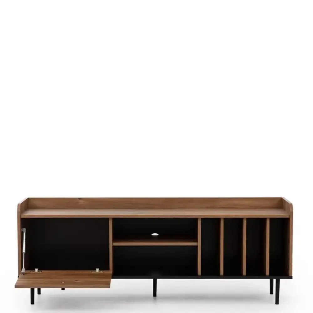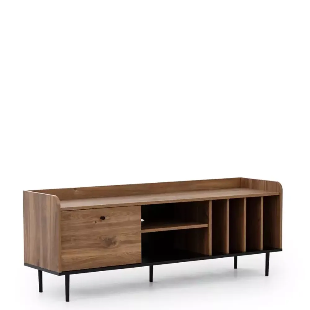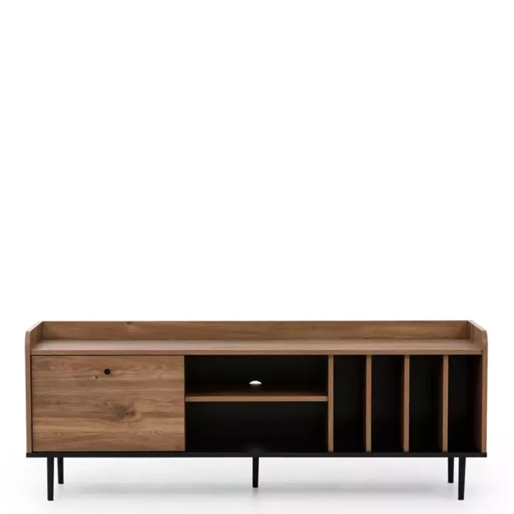 - Duża szafka RTV z centralnie umieszczoną półką na sprzęt elektroniczny kilka wąskich wnęk po prawej stronie, oraz szafkę z klapą otwieraną do dołu.