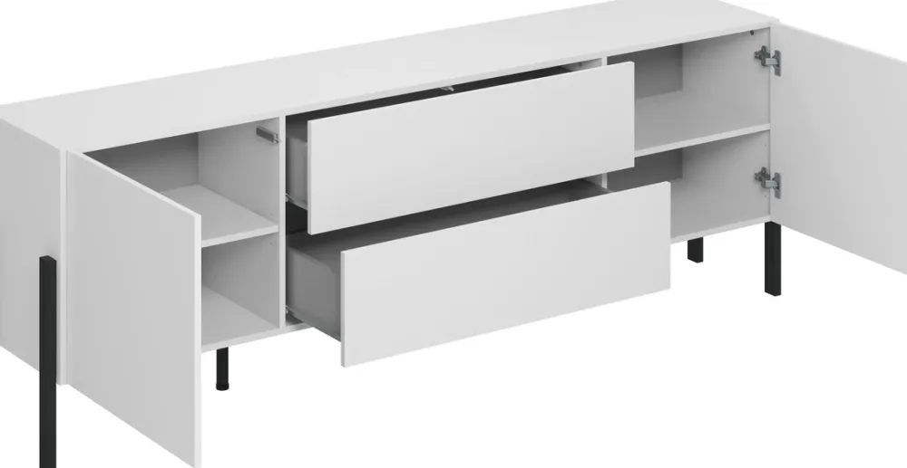 Zadbaj o styl i porządek w swoim salonie z nowoczesną szafką RTV JUKON. Minimalistyczna forma, eleganckie białe wykończenie w macie oraz praktyczny układ z dwiema pojemnymi szufladami i dwiema szafkami sprawiają, że to idealna baza pod Twój telewizor i domowe centrum rozrywki.