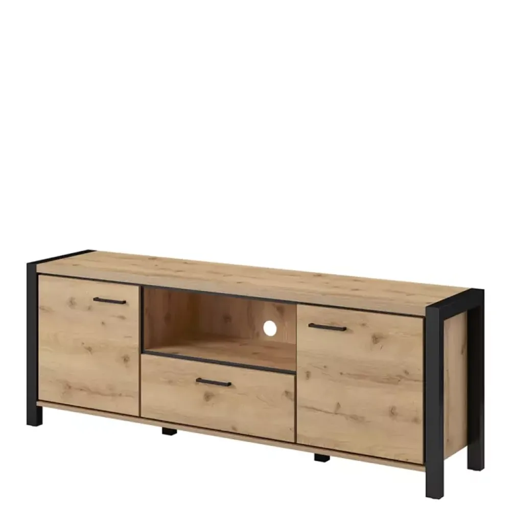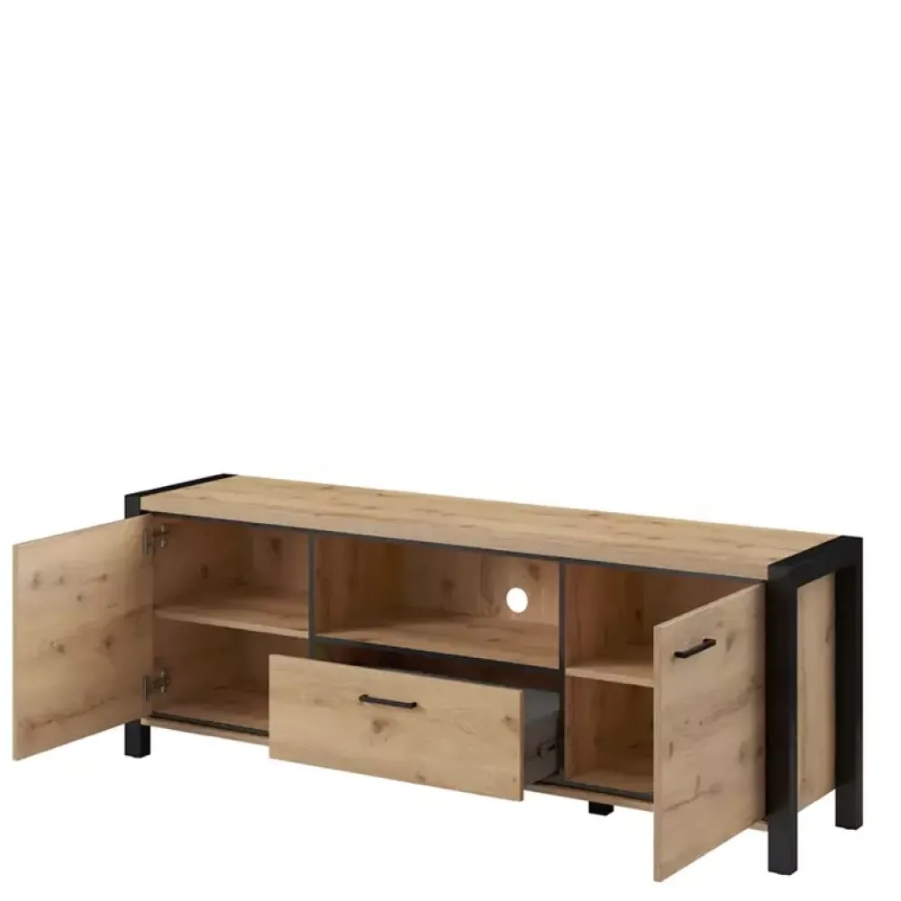 Szafka RTV ANGELINO posiada 180 cm szerokości oraz została wyposażona w drzwi po lewej i prawej stronie, za każdymi z nich znajdują się dwa poziomy pozwalające przechować przedmioty, które chcemy ukryć przed światłem dziennym. Natomiast w centralnej części szafki swoje miejsce odnalazła szuflada osadzona na prowadnicach kulkowych z pełnym wysuwem oraz wnęka z otworem na kable, dzięki któremu doskonale sprawdzi się do umieszczenia dekodera.