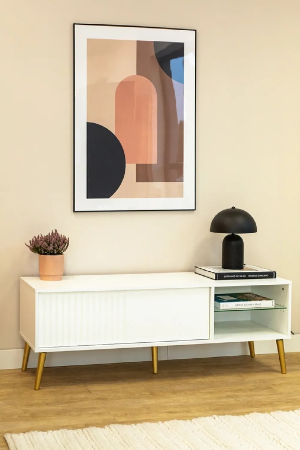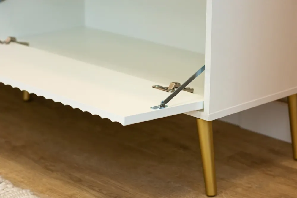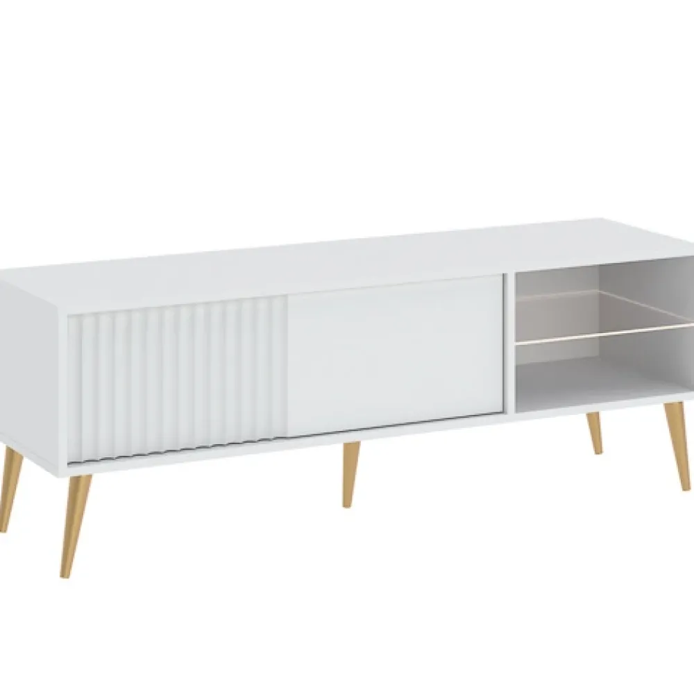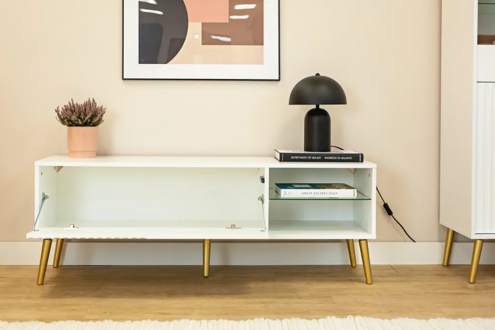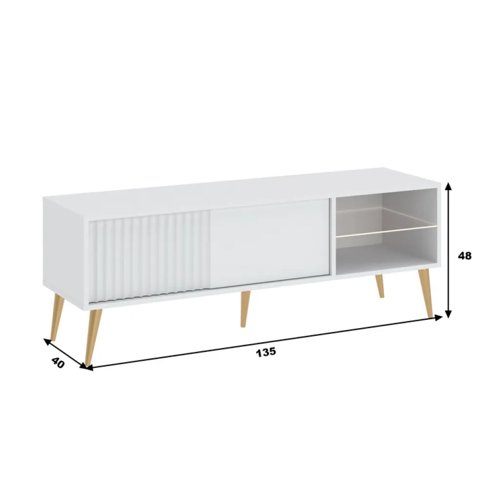 Szafka RTV BELLUNO o szerokości 135 cm to stylowe i funkcjonalne rozwiązanie do nowoczesnych wnętrz. Jej minimalistyczna forma w eleganckim białym wykończeniu przyciąga wzrok, a ozdobne, ryflowane fronty z MDF nadają całości unikalnego charakteru. Dzięki systemowi „push to open” nie potrzebujesz uchwytów – wystarczy delikatne naciśnięcie, by otworzyć klapę. Praktyczne półki umożliwiają wygodne przechowywanie sprzętu RTV i akcesoriów.