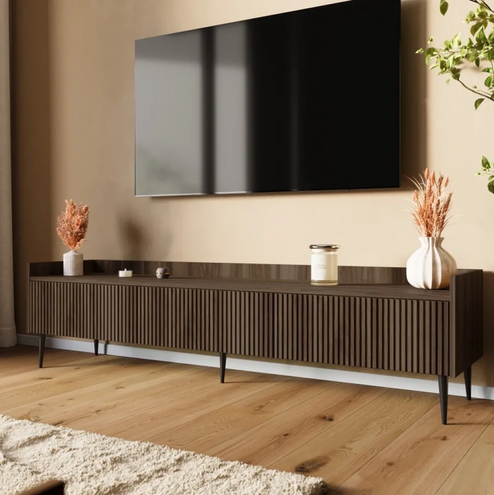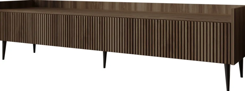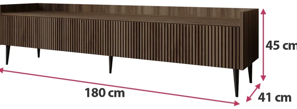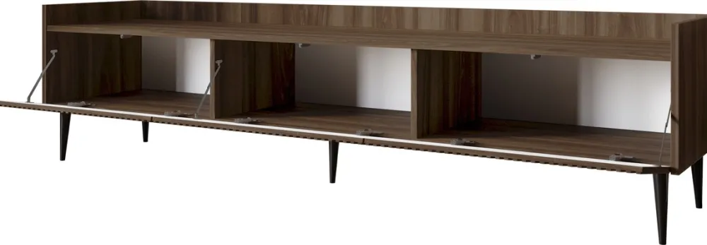 - Długa szafka RTV o szerokości 180 cm ASPERO wyróżnia się ryflowanymi frontami wykonanymi z płyty MDF, wysokimi metalowymi nóżkami w kolorze czarnym, a także trojgiem drzwi otwieranych za pomocą systemu push to open. Szafka RTV w kolorze orzech.