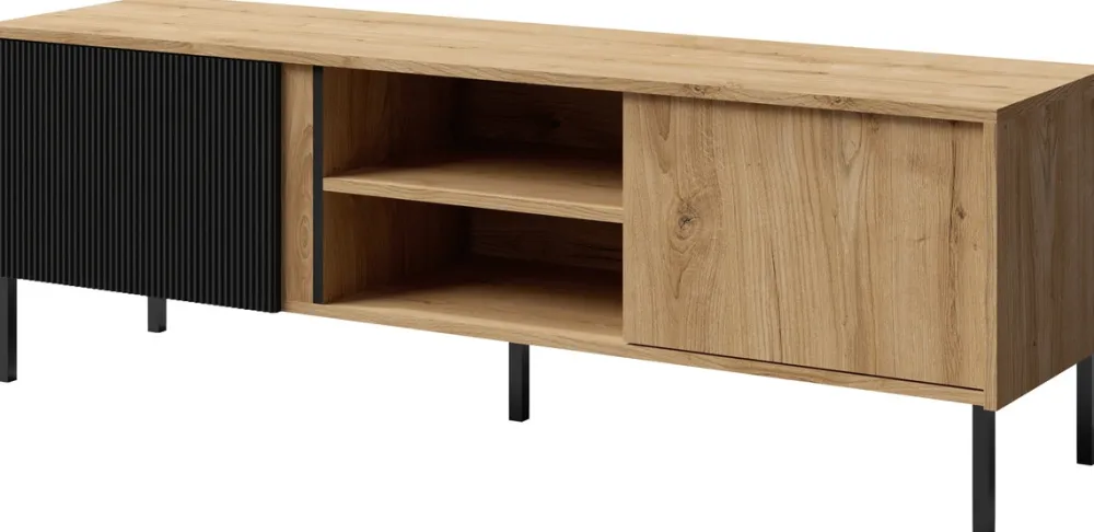- Nowoczesna szafka RTV MALEZJA o szerokości 150 cm oparta została na wysokich metalowych nóżkach. Szafka RTV z lamelami oferuje sporo miejsca do przechowywania dzięki dwóm otwartym półkom oraz dwóm półkom ukrytym za drzwiami.