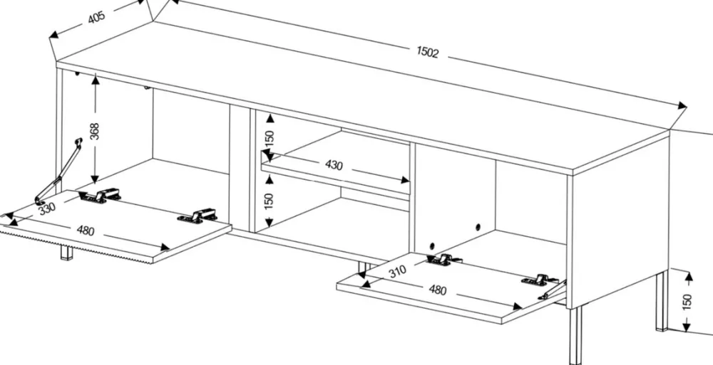 Nowoczesna szafka RTV 150 cm oferuje praktyczne rozwiązania do przechowywania. Znajdziesz w niej dwie otwarte półki, idealne na sprzęt audio-wideo, dekodery czy konsole. Dodatkowo, za każdymi drzwiami znajduje się półka, która zapewnia dodatkową przestrzeń na Twoje rzeczy.