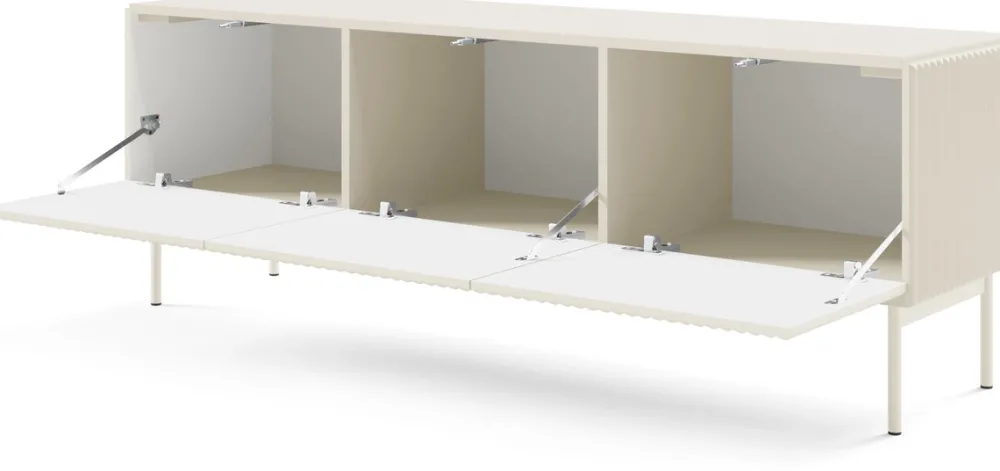 - Szafka RTV o wymiarach wykonana z laminowanej płyty i ryflowanej MDF w kolorze kaszmir. Posiada trzy komory, system push to open, metalowe nogi (18 cm), obrzeża ABS. Bezuchwytowy front podkreśla nowoczesny styl i funkcjonalność.