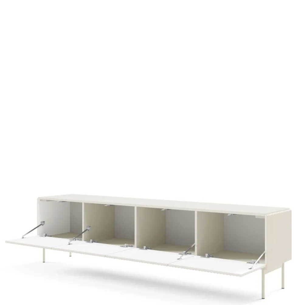- Szafka RTV wykonana z laminowanej płyty i ryflowanej MDF w kolorze kaszmir. Posiada trzy komory, system push to open, metalowe nogi 18 cm, obrzeża ABS. Bezuchwytowy front podkreśla nowoczesny styl i funkcjonalność. Idealna pod telewizor do 85 cali.