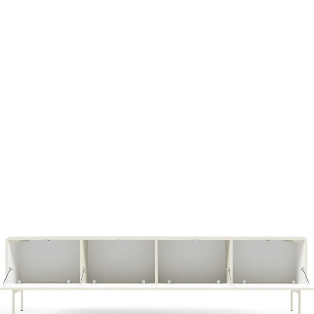 Szafka RTV ryflowana w kolorze kaszmir to idealna propozycja dla osób ceniących jasne, przytulne wnętrza oraz funkcjonalność ukrytą w eleganckiej formie. Delikatny odcień kaszmiru w połączeniu z ryflowanym frontem i bezuchwytowym systemem push-to-open tworzą nowoczesny, a zarazem ponadczasowy design. To mebel, który nie tylko zdobi, ale też ułatwia organizację przestrzeni w salonie.