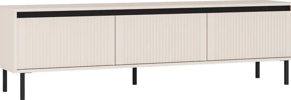 - Szafka RTV OMEGA o szerokości 178 cm posiada trzy pojemne szuflady, które charakteryzują się wykonaniem z solidnej płyty MDF o grubości 16 mm i głębokimi frezowaniami. Szafka pod telewizor stoi na malowanych proszkowo metalowych nóżkach o wysokości 15 cm.