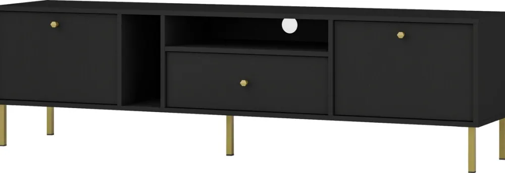 Szafka RTV o długości 180 cm została zaprojektowana z myślą o maksymalnym wykorzystaniu przestrzeni. Wyposażona w jedną pojemną szufladę oraz dwoje drzwi, oferuje dużo miejsca na przechowywanie niezbędnych akcesoriów RTV, jak piloty, kable czy kolekcje filmów i gier. Metalowe nóżki o wysokości 13,5 cm nadają meblowi nowoczesnego charakteru i zapewniają stabilność.