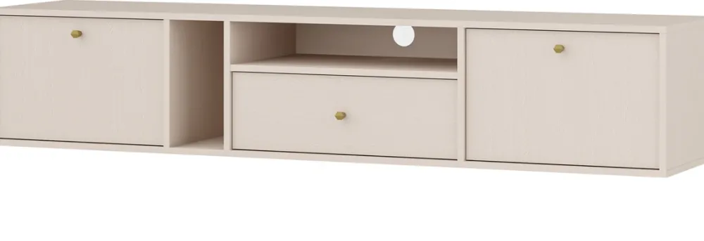 - Szafka RTV 180 cm TOKEN posiada drzwi po prawej oraz lewej stronie, w centralnej części mebla znajduje się szuflada oraz dwie wnęki na akcesoria i dekoracje. Wisząca szafka RTV posiada metalowe uchwyty w stylowym kształcie.