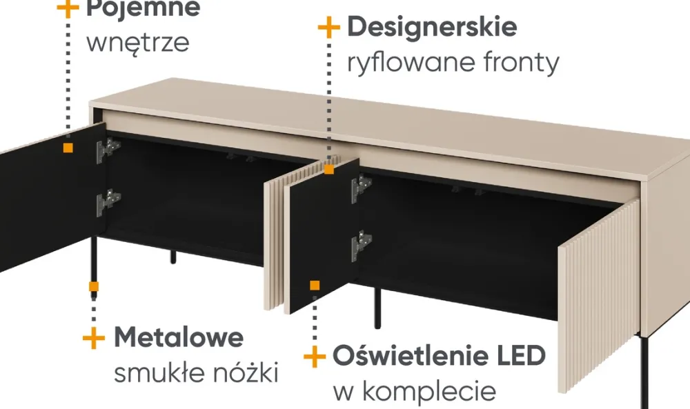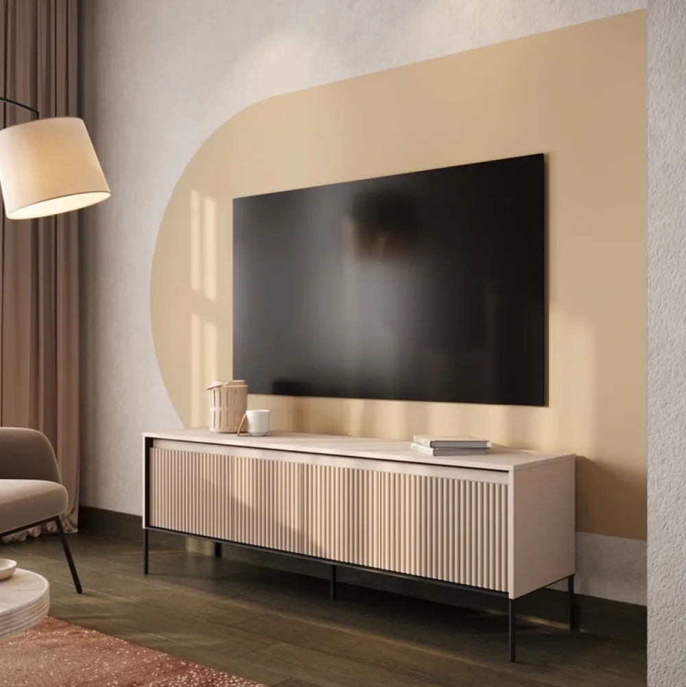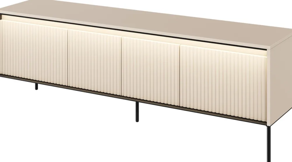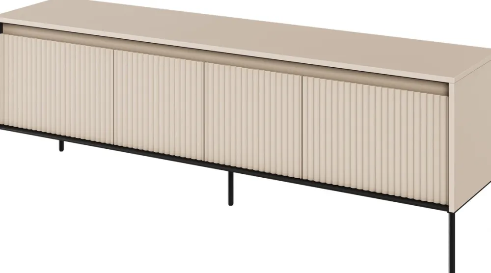 Nowoczesna szafka RTV, stojąca na wysokich nóżkach, prezentuje niepowtarzalną kombinację płyty MDF o grubości 18 mm i laminowanej płyty o grubości 16 mm. Subtelny beż piaskowy doda delikatnego uroku każdemu pomieszczeniu, podkreślając jednocześnie naturalny, lekki wygląd mebla.
