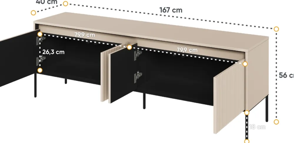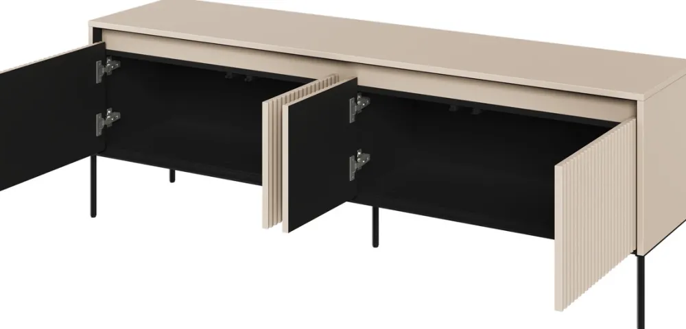 Ten elegancki mebel posiada cztery drzwi, które umożliwiają łatwe przechowywanie urządzeń RTV i innych drobiazgów, zachowując zarazem minimalistyczny i schludny wygląd.