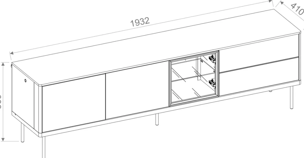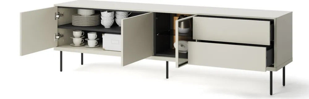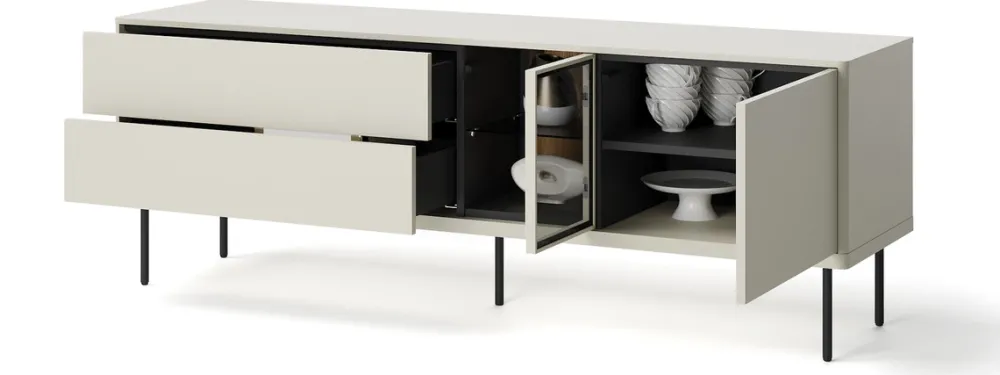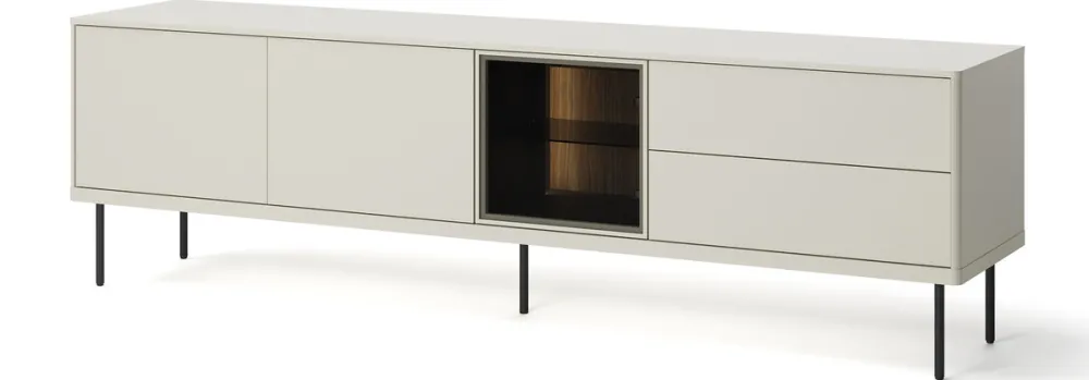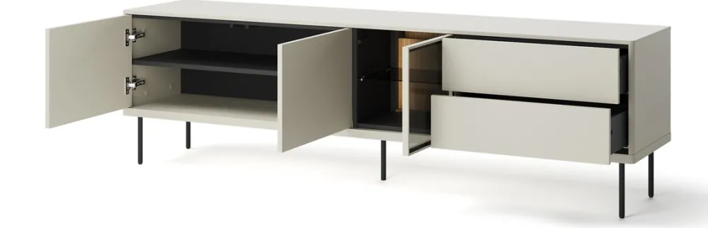 Czarne, wysokie metalowe nogi nadają meblowi wizualnej lekkości i podkreślają jego nowoczesny charakter. Fronty otwierane systemem push to open zapewniają wygodę użytkowania i podkreślają minimalistyczny design. Podświetlana szklana półka w centralnej części dodaje meblowi wyjątkowego uroku, tworząc elegancki akcent świetlny w Twoim salonie.