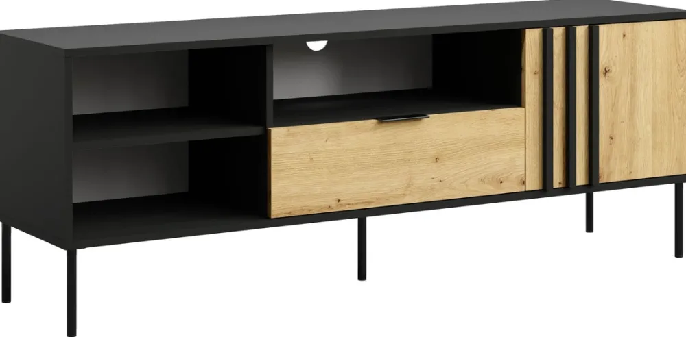 - Czarna szafka RTV RUSTICA 160 cm z dębem artisan to idealne połączenie loftowego stylu i funkcjonalności. Posiada 4 półki, szufladę i szafkę, a dzięki metalowym nogom 18 cm wygląda lekko i elegancko. Doskonała pod telewizor do 70 cali.