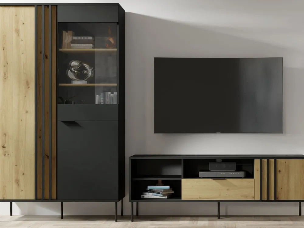 RUSTICA to szafka RTV do salonu, która zachwyca przemyślanym układem – otwarte półki idealnie nadają się na sprzęt elektroniczny, a zamykane przestrzenie zapewniają miejsce na dokumenty, piloty czy gry. Jej czarny korpus w połączeniu z naturalnym dekorem drewna wprowadza do wnętrza nowoczesną harmonię z nutą przytulności.