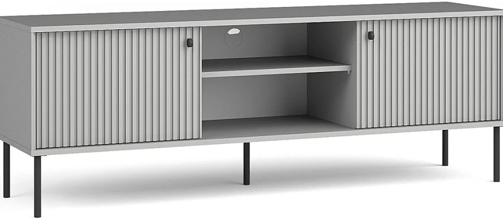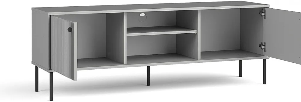 - Szafka RTV IRYS 156 cm w eleganckim, szarym kolorze z ryflowanymi frontami MDF i czarnymi, metalowymi nogami mieści telewizor do 65 cali. Dwie szafki i wnęki zapewniają praktyczne przechowywanie, a nowoczesny design idealnie dopełnia aranżacje salonu.