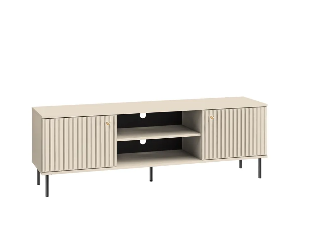 - Przedstawiamy elegancką szafkę RTV do salonu. Korpus wykonany z płyty laminowanej, a fronty z płyty MDF w kolorze cashmere. Szafką posiada drzwi z cichym domykiem, metalowe nóżki w kolorze czarnym oraz metalowe uchwyty w kolorze złotym.