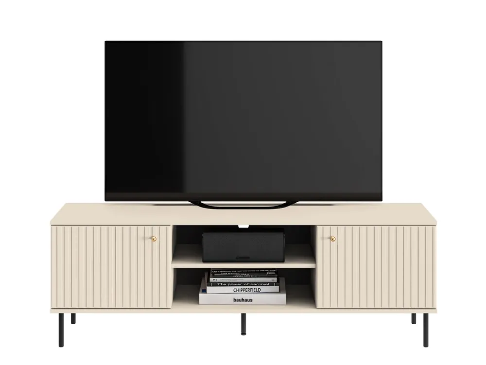 Szafka RTV dostępna jest w modnym kolorze cashmere, który idealnie komponuje się z różnorodnymi aranżacjami wnętrz, dodając im ciepła i nowoczesnego charakteru. Obrzeża mebla zabezpieczone zostały trwałą okleiną ABS, co dodatkowo chroni je przed uszkodzeniami i zapewnia estetyczny wygląd przez długi czas.
