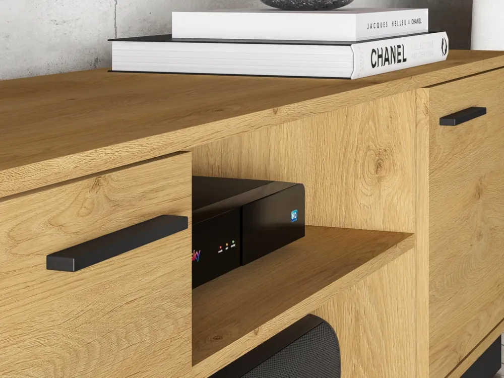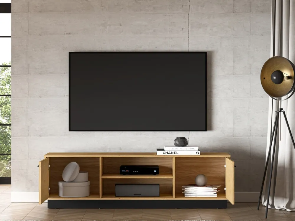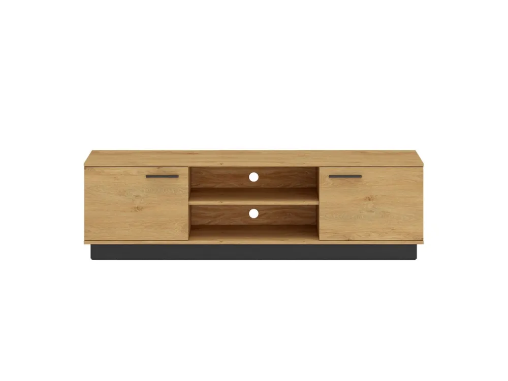 - Szafka RTV MONELLI 170 cm w kolorze dąb stylowy to loftowy mebel z dwiema szafkami, otwartymi półkami i otworami na kable. Cichy domyk i trwałe materiały zapewniają funkcjonalność i styl w nowoczesnym salonie.