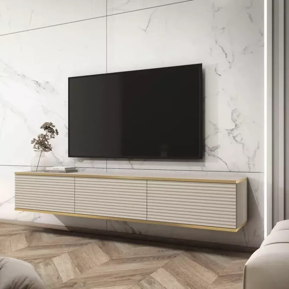 - Nowoczesna wisząca szafka RTV do salonu ORVIETO w kolorze beżowym. Ma ona 175 cm szerokości. W tej szafce posiadamy troje eleganckich ryflowanych frontów drzwi oraz złote wstawki.