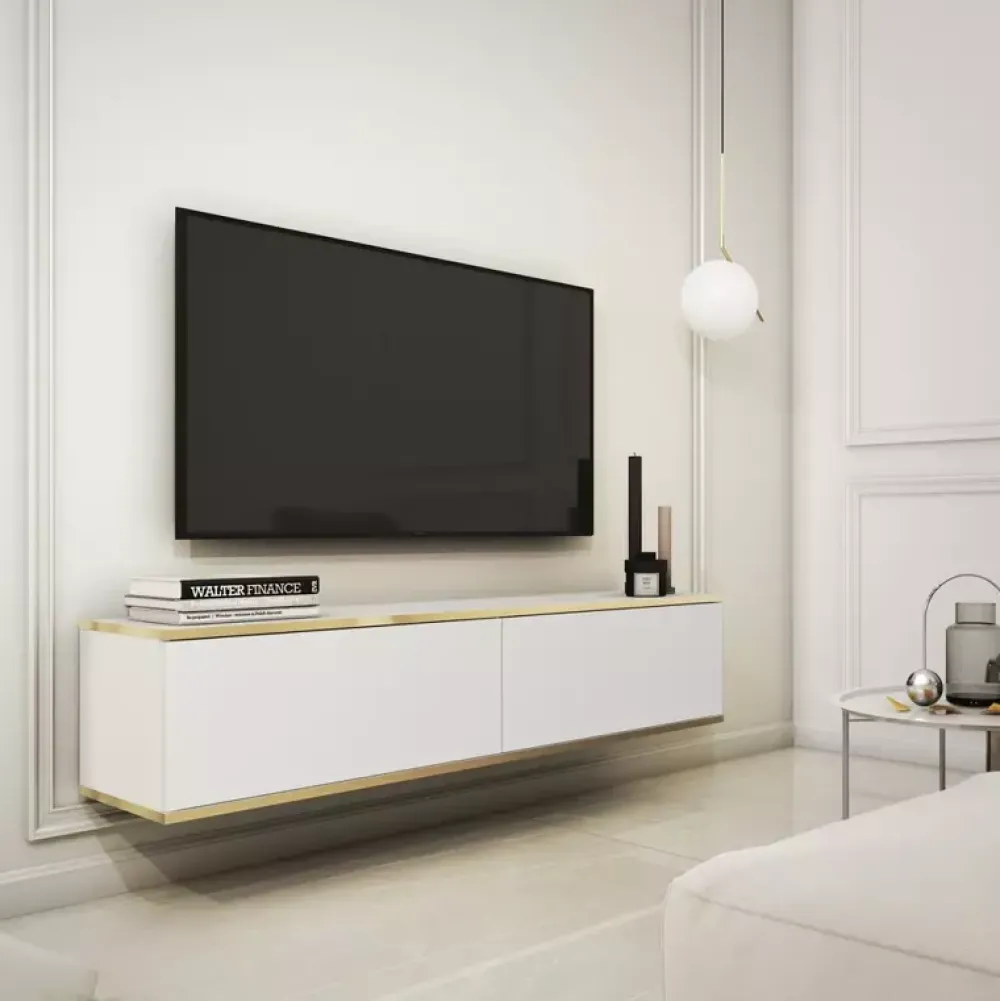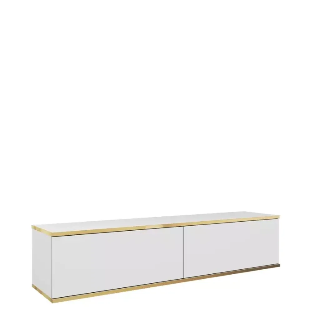 Szafka RTV ORVIETO w połączeniu białego koloru ze złotymi wstawkami jest eleganckim wyposażeniem każdego wnętrza i odświeży je. Szafka ma 135 cm szerokości i 30 cm wysokości. Będzie się ona modnie prezentowała bez względu na to czy ją powiesisz na ścianie, czy postawisz na podłodze, co daje możliwość wielu aranżacji wnętrza. Występują w niej dwoje drzwi osadzone na zawiasach puszkowych z otwieranie typu push to open. Krawędzie mamy wykończone obrzeżem ABS. Szafka wykonana jest w najwyższej jakości płyty laminowanej.