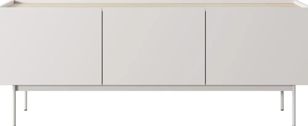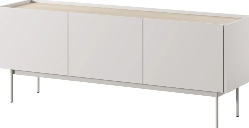 Szafka RTV została wyposażona w trzy drzwi z mechanizmem cichego domyku, które zapewniają bezgłośne i płynne otwieranie. Dzięki temu użytkowanie jest wyjątkowo komfortowe, a mechanizmy wewnętrzne pozostają chronione przed nadmiernym zużyciem. Drzwi otwierają się za krawędź, eliminując potrzebę wystających uchwytów, co podkreśla nowoczesny charakter mebla.