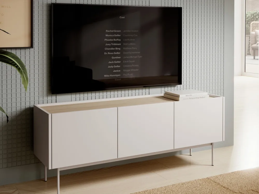 Szafka RTV 144 cm doskonale wpisuje się w aranżacje nowoczesne, skandynawskie oraz industrialne. To mebel, który nie tylko pomieści sprzęt RTV, kable czy akcesoria, ale również stanie się eleganckim elementem dekoracyjnym salonu. Jej kompaktowe wymiary sprawiają, że sprawdzi się zarówno w mniejszych, jak i większych przestrzeniach.