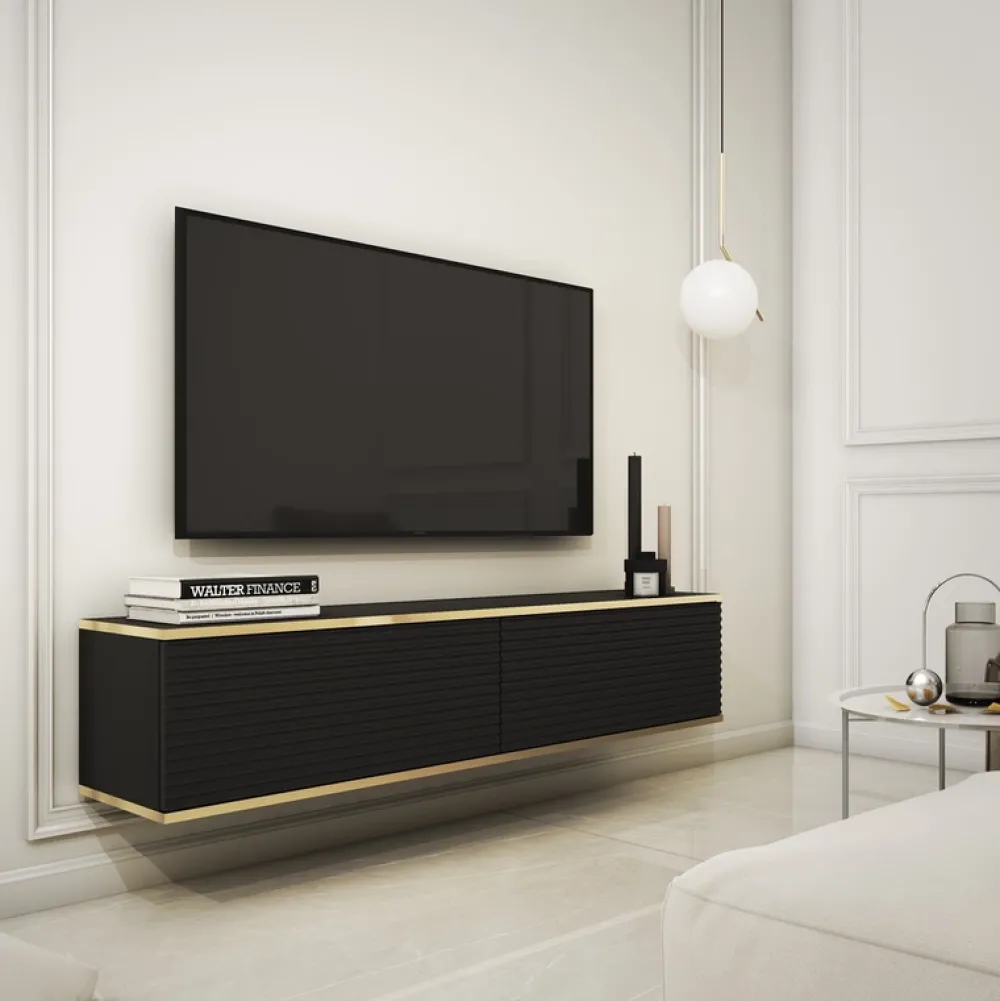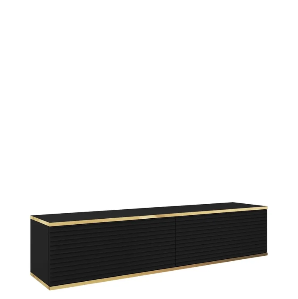 Szafka RTV ORVIETO to stylowa i funkcjonalna propozycja do każdego salonu. Jest ona uniwersalna, bo może zostać umocowana na ścianie lub postawiona na podłodze, co daje możliwość wielu aranżacji, zależnie od potrzeby. Designerskie wykończenie złotą okleiną przykuwa uwagę każdej osoby. Fronty drzwi są ryflowane w kolorze czarnym. Zostały one wyposażone w system otwierania typu push to open, dzięki czemu są wygodniejsze i praktyczne w codziennym użytkowaniu, wystarczy lekko nacisnąć na front mebla, aby móc je otworzyć.