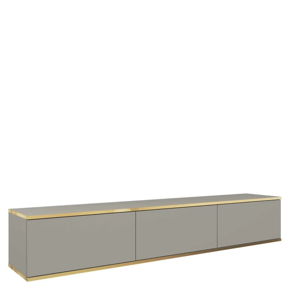 - Nowoczesna szafka RTV do salonu ORVIETO w kolorze szarym ze złotą okleiną. Ma 175 cm szerokości. Posiada wygodny bezuchwytowy system otwierania push to open. Krawędzie są zakończone okleiną ABS.