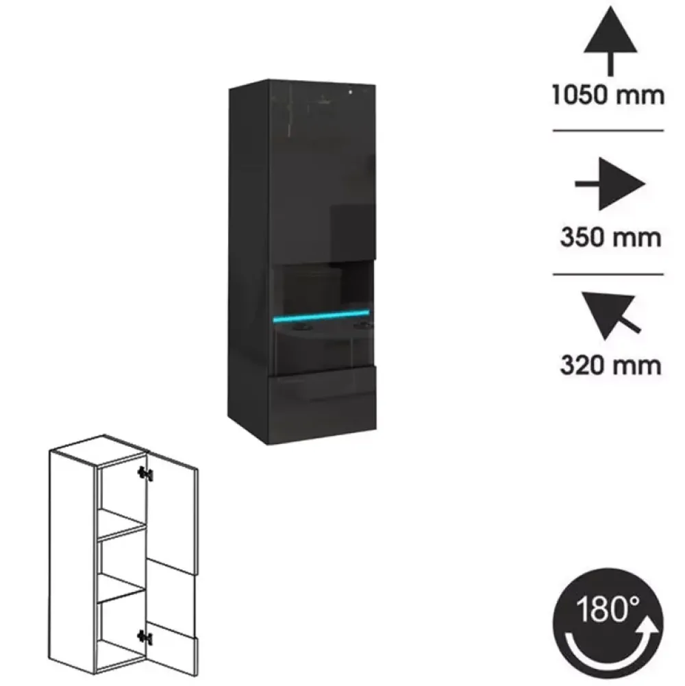 - Oświetlenie LED – Szafka posiada możliwość doposażenia w dedykowane oświetlenie szklanych półek LED, które znajduje się w zakładce „Kup razem” pod galerią zdjęć.
