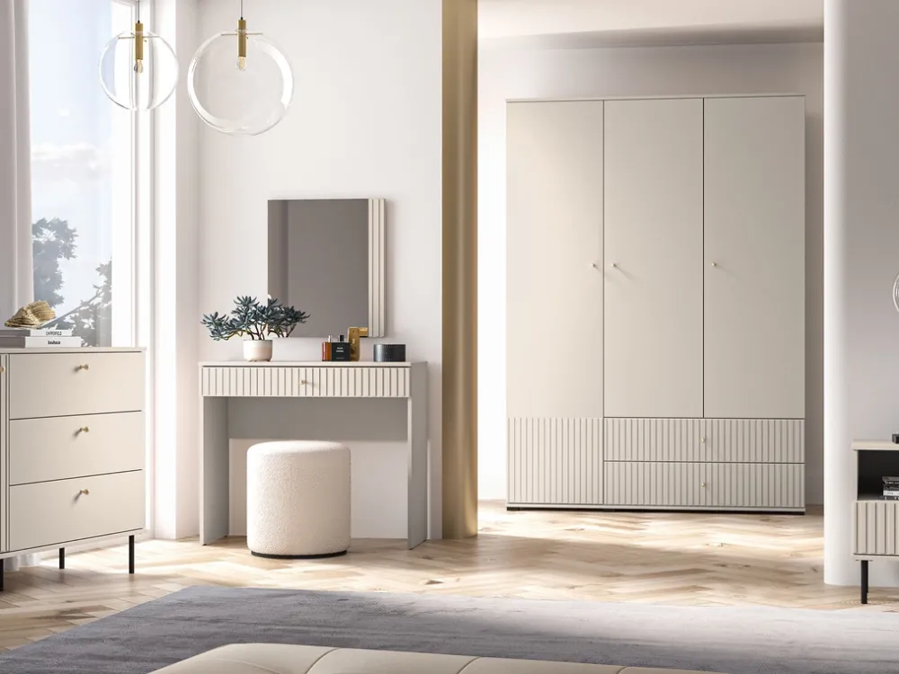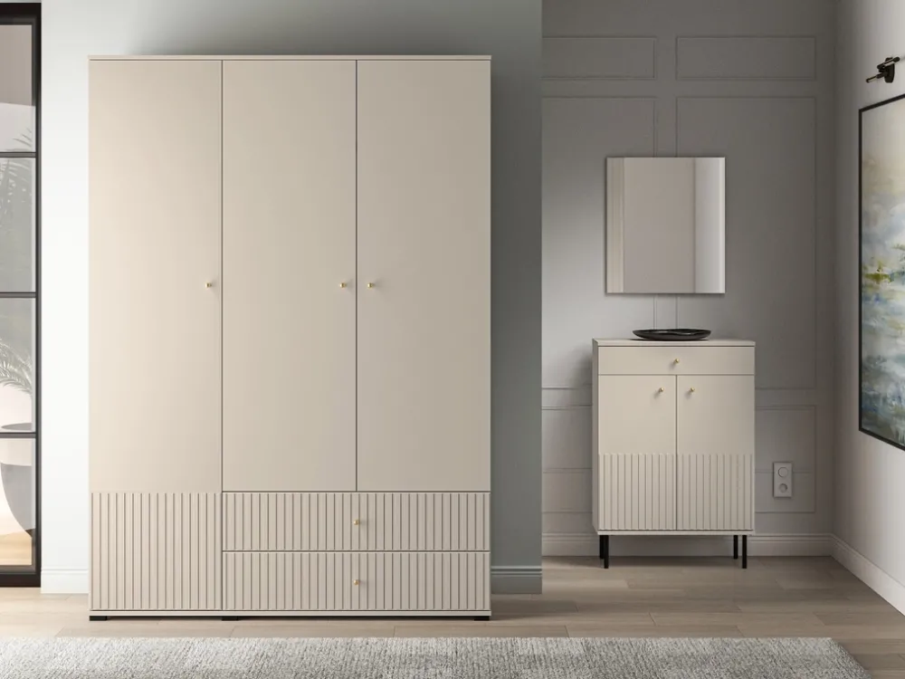 Dekoracyjne lamele na froncie i szufladach dodają meblowi charakteru, a złote uchwyty stanowią subtelny, luksusowy akcent. Szafa SOPHIE to połączenie stylu i praktyczności, które odnajdzie się zarówno w klasycznej sypialni, jak i nowoczesnym przedpokoju.