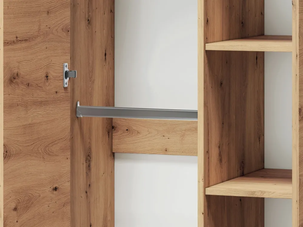 Szafa została zaprojektowana z myślą o maksymalnym wykorzystaniu przestrzeni. Drzwi po lewej stronie kryją dwa aluminiowe drążki, które są idealne do przechowywania odzieży wiszącej – od eleganckich garniturów po codzienne stroje. Po prawej stronie znajdują się drzwi z pięcioma solidnymi półkami, które doskonale sprawdzą się do organizacji mniejszych przedmiotów, takich jak bielizna, dodatki czy ręczniki.