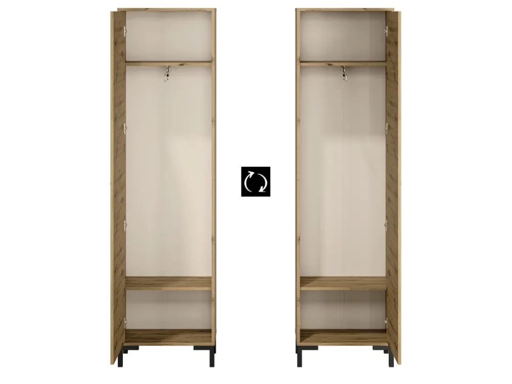 To praktyczne rozwiązanie do każdego przedpokoju. Szafa jest jednodrzwiowa, a możliwość montażu drzwi zarówno w wersji prawostronnej, jak i lewostronnej, pozwala na elastyczne dopasowanie mebla do indywidualnych potrzeb i układu pomieszczenia.