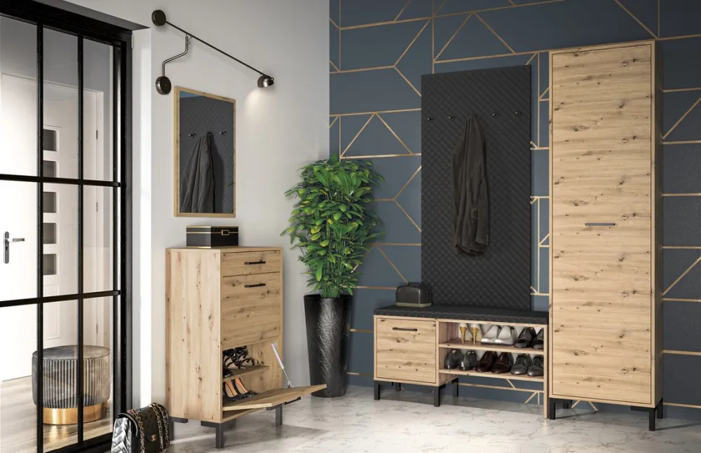 Przedstawiamy Państwu nowoczesną i elegancką szafę NEVIO do przedpokoju, wykonaną z wysokiej jakości płyty laminowanej. Jej wybarwienie w odcieniu dębu artisan nadaje wnętrzu przytulny i naturalny charakter, idealnie wpisując się w aktualne trendy wnętrzarskie.