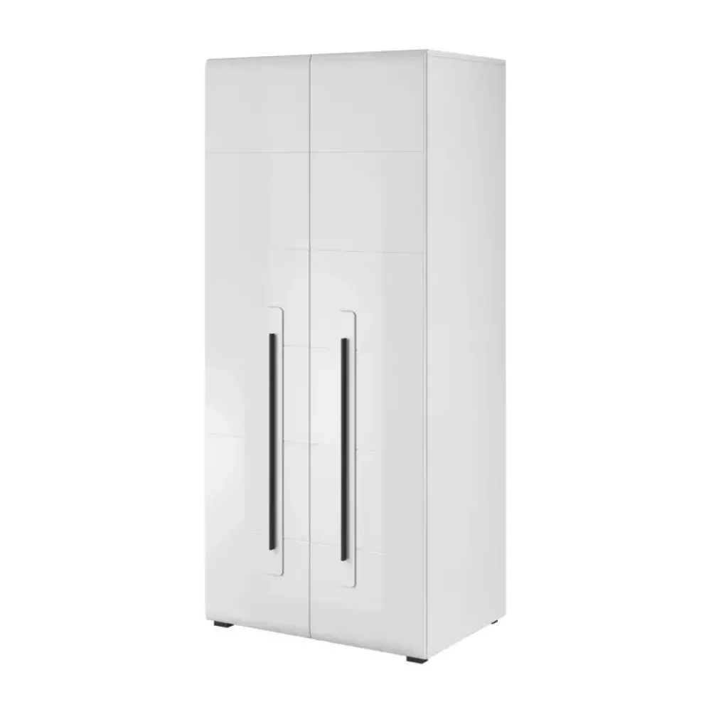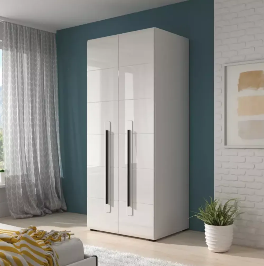 Nowoczesna szafa uchylna do salonu o szerokości 90 cm, wyposażona w drążek oraz półkę.