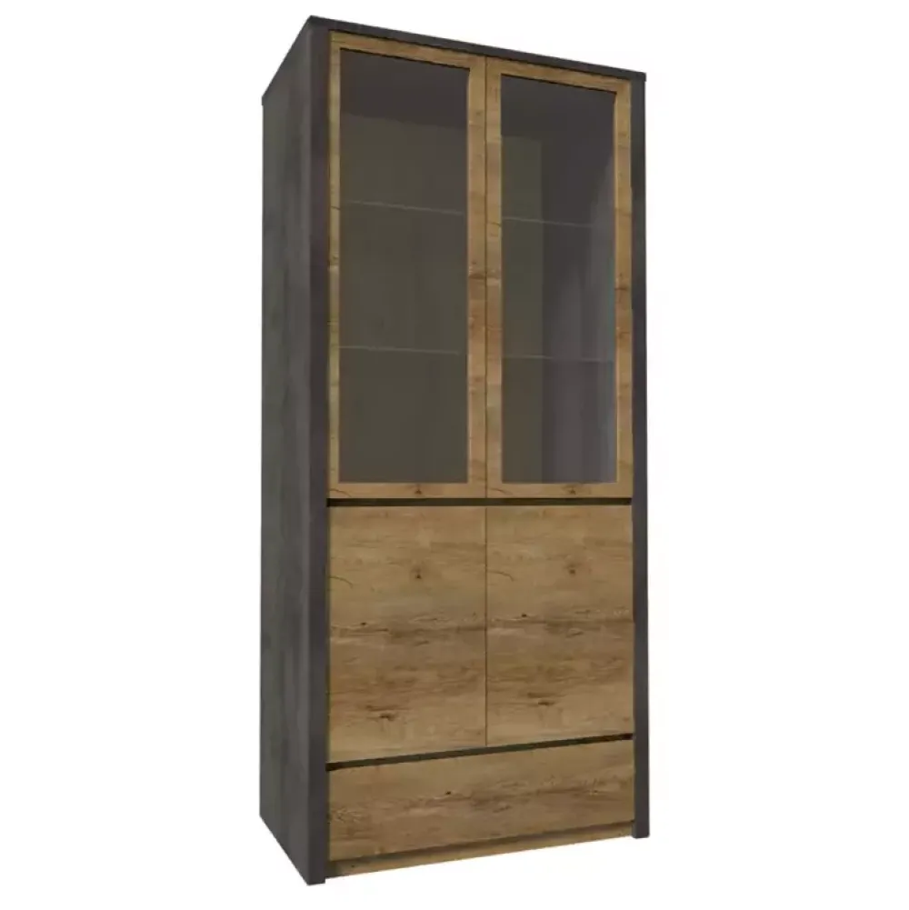 Witryna MERIZO została wykonana w nowoczesnej stylistyce, dzięki której doskonale spisuje się we współczesnych aranżacjach salonów. Posiada dwie półki znajdujące się za przeszklonymi drzwiami, na których możesz umieścić swoją porcelanę oraz dwa poziomy za drzwiami poniżej. Dodatkowo witryna posiada pojemną szufladę u dołu, na drobne akcesoria.