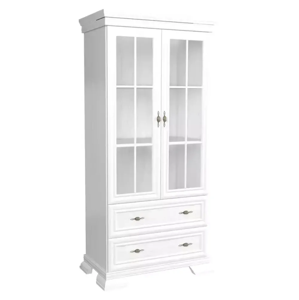 Witryna KOLONIA została wyposażona we dwie szuflady znajdujące się u dołu, które doskonale sprawdzą się do umieszczenia w nich rozmaitych akcesoriów. Natomiast nad nimi swoje miejsce znalazła para przeszklonych drzwi przez które widoczne są trzy półki na porcelanę oraz inne rozmaite dekory.