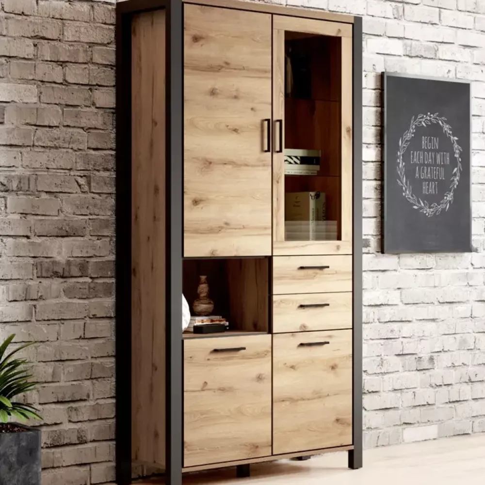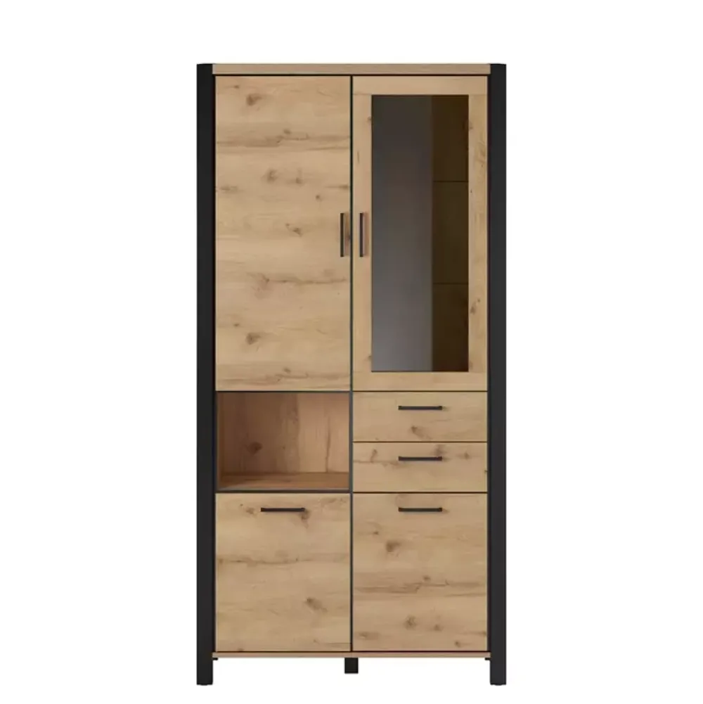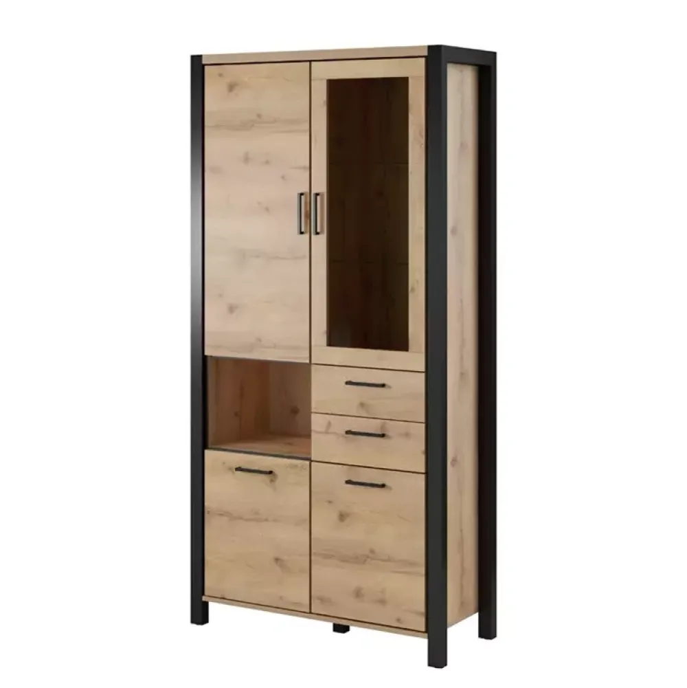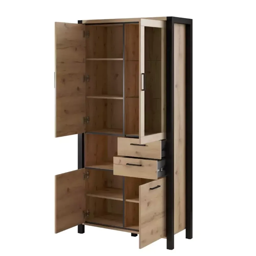 Witryna ANGELINO została wyposażona w drzwi z witryną, za którymi znajdują się półki wykonane ze szkła hartowanego z możliwością doposażenia w opcjonalne podświetlenie LED. Natomiast pozostałe drzwi skrywają za sobą poziomy, które sprawdzą się do przechowywania przedmiotów, które chcemy ukryć przed światłem dziennym. Dodatkowo witryna posiada dwie szuflady osadzone na prowadnicach kulkowych z pełnym wysuwem, które sprawdzą się do przechowania drobnych akcesoriów.