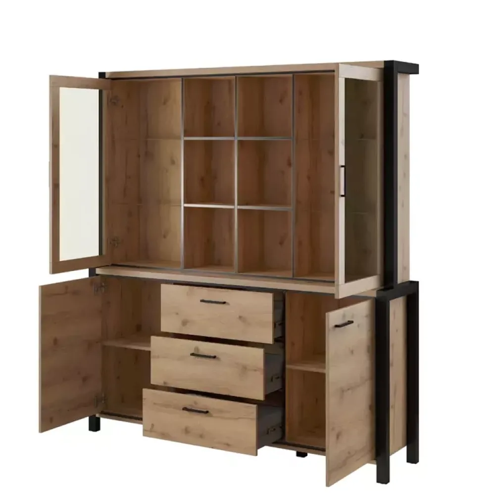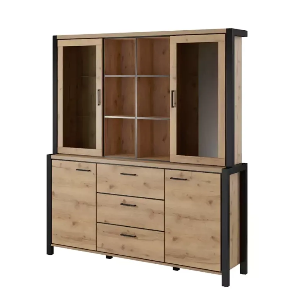 Kredens ANGELINO to propozycja wykonana w nowoczesnej stylistyce, dzięki której uczyni twój salon nowoczesnym oraz ponadczasowym. Posiada cztery drzwi, wśród których dwoje zostały przeszklone, i doskonale sprawdzą się do umieszczenia porcelany i rozmaitych drobnych dodatków oraz dekorów. Kredens posiada również trzy pojemne szuflady osadzone na prowadnicach kulkowych z pełnym wysuwem, i trzy otwarte poziomy na książki lub drobne akcesoria przeznaczone do eksponowania. Dodatkowo uchwyty wykonano z metalu w matowym wykończeniu i czarnym kolorze, dzięki czemu nadają kredensowi industrialnych akcentów stylistycznych.