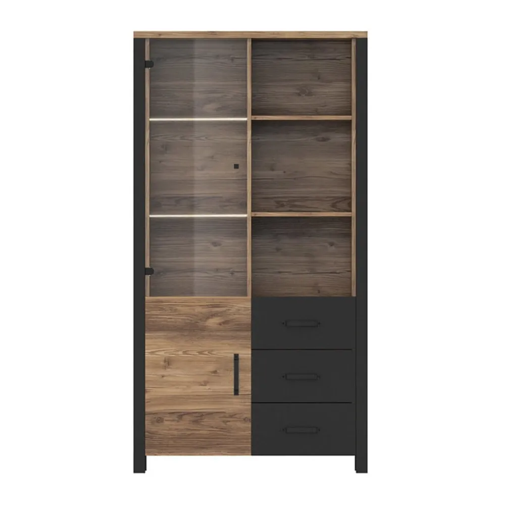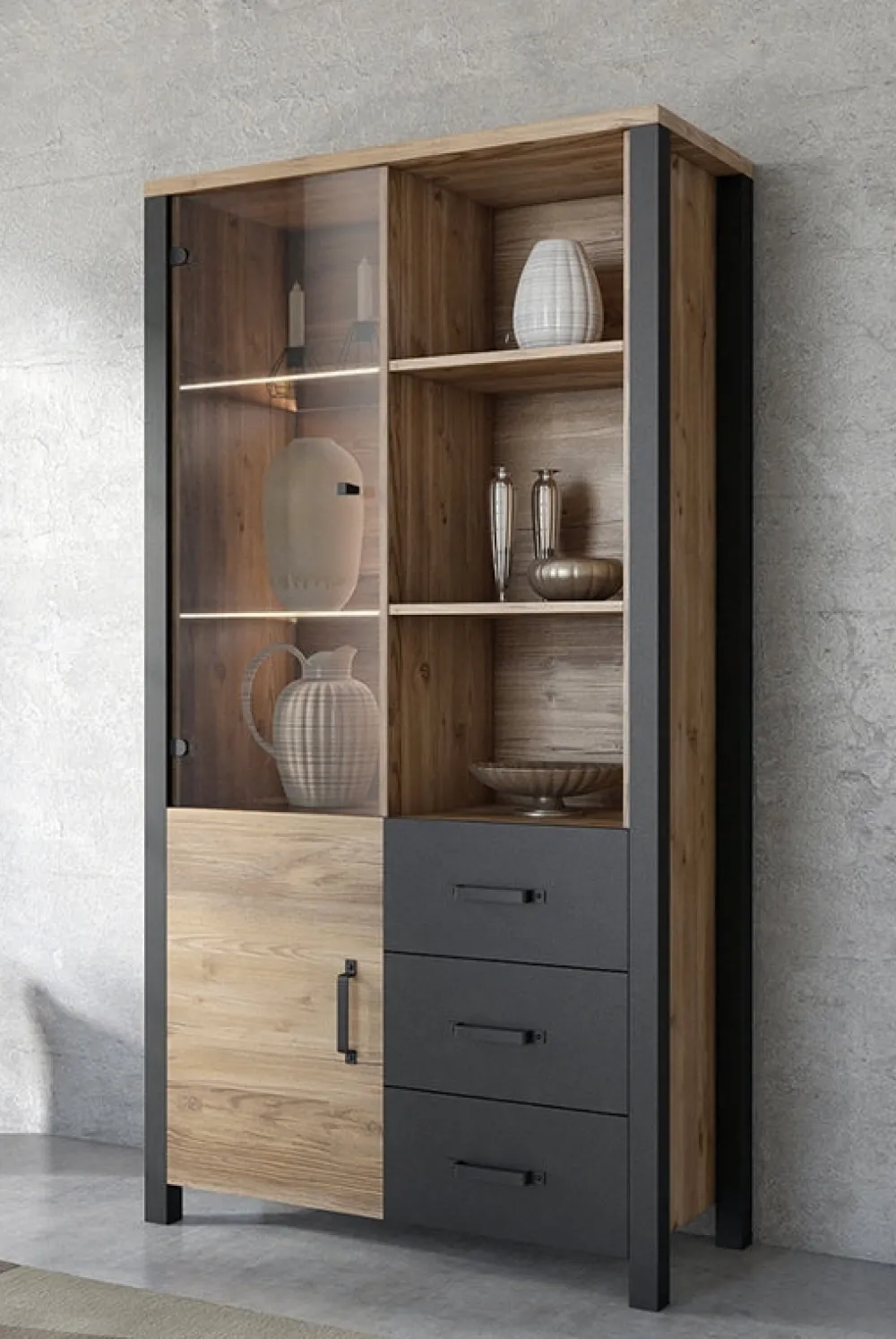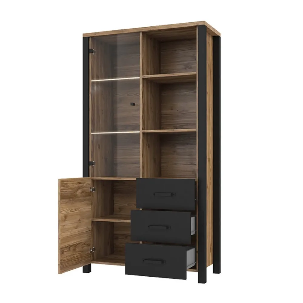 Nowoczesna witryna do salonu o szerokości 101 cm w stylu industrialnym, wyposażona w drzwiczki uchylne, szuflady oraz półki.