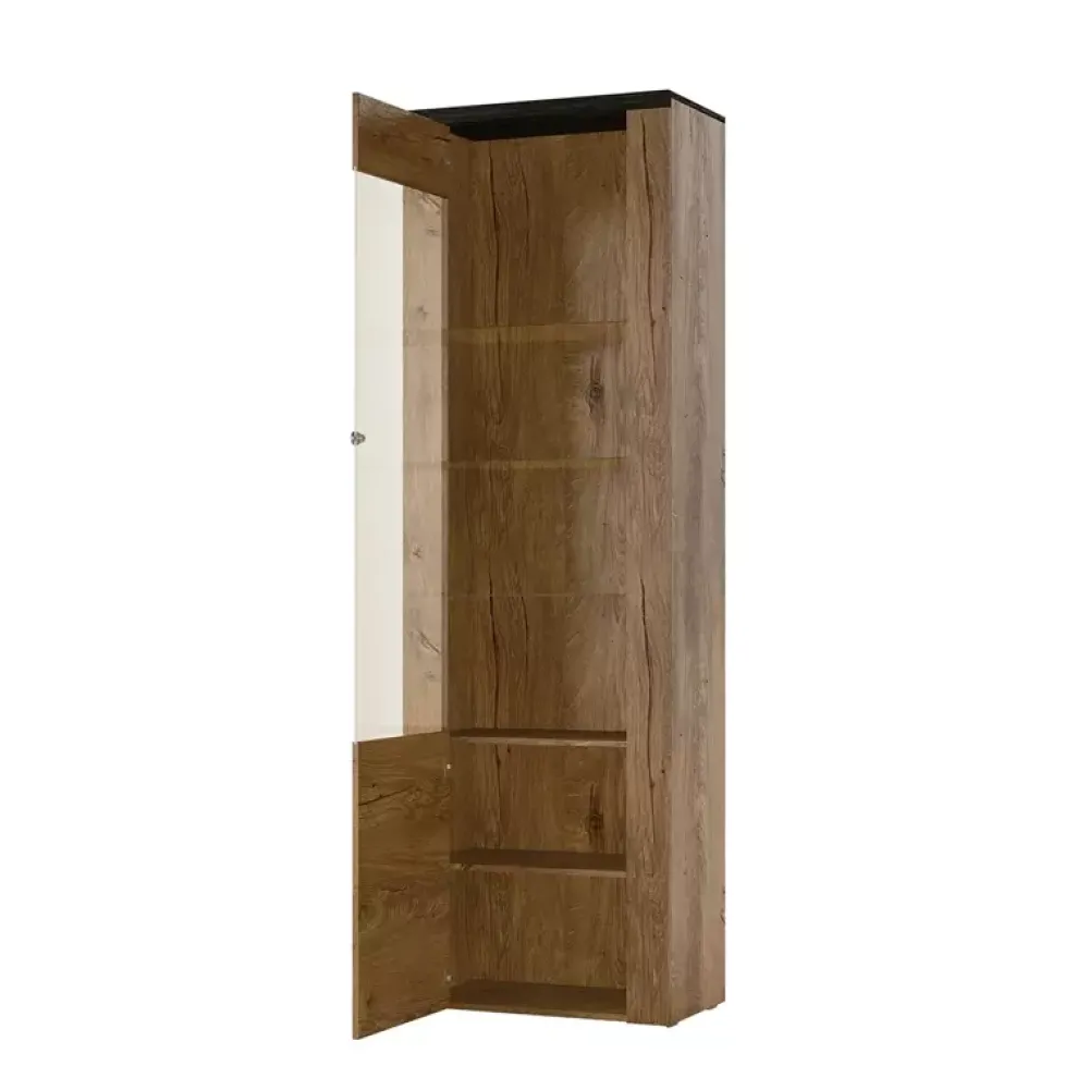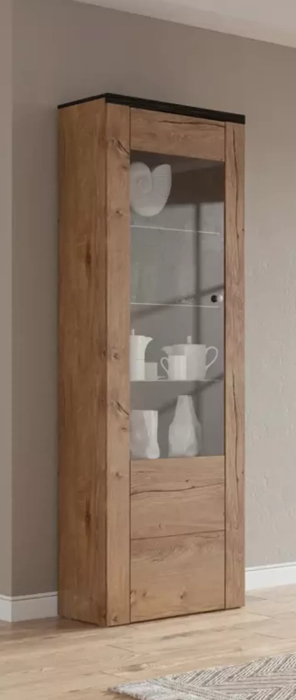 Elegancka witryna stojąca o szerokości 65 cm wyposażona w drzwiczki uchylne, za którymi znajdują się półki.