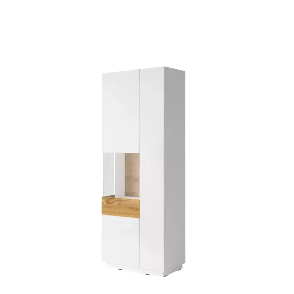 Witryna stojąca z oszklonymi drzwiczkami lewostronnymi i półkami o szerokości 80 cm ze wstawkami w kolorze dąb Wotan.