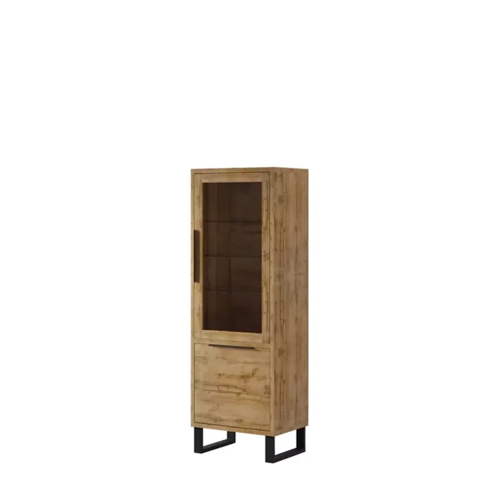 Nowoczesna witryna szklana do salonu o szerokości 64cm wyposażona w drzwiczki uchylne, za którymi znajdują się półki.
