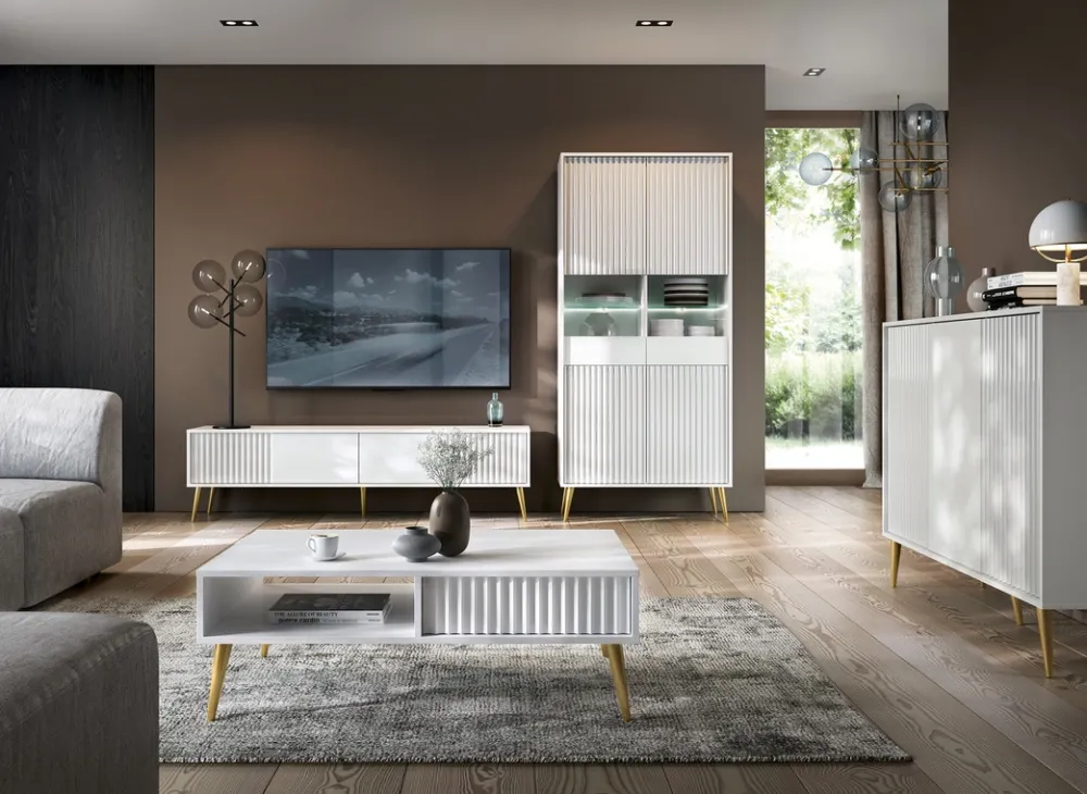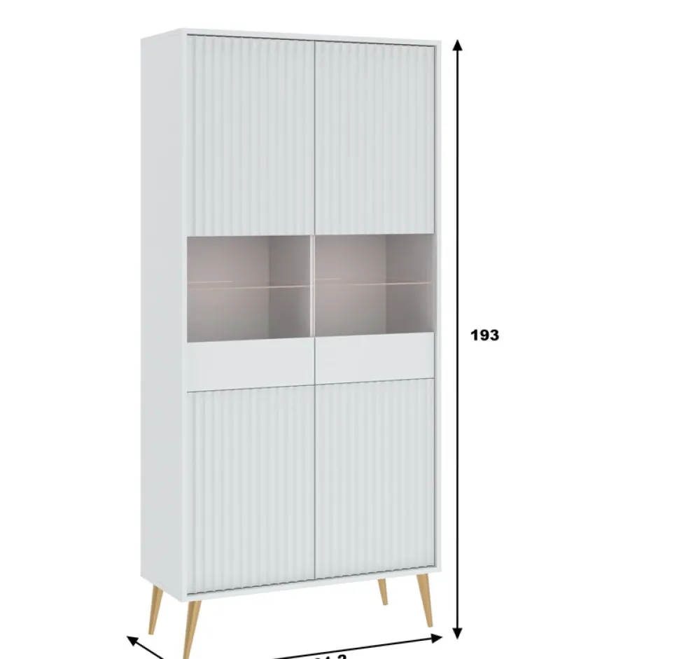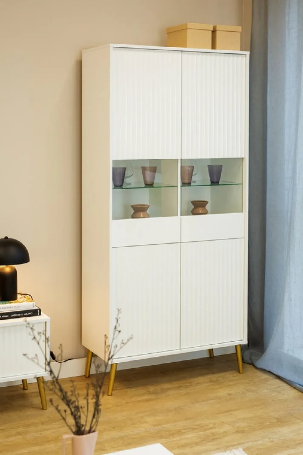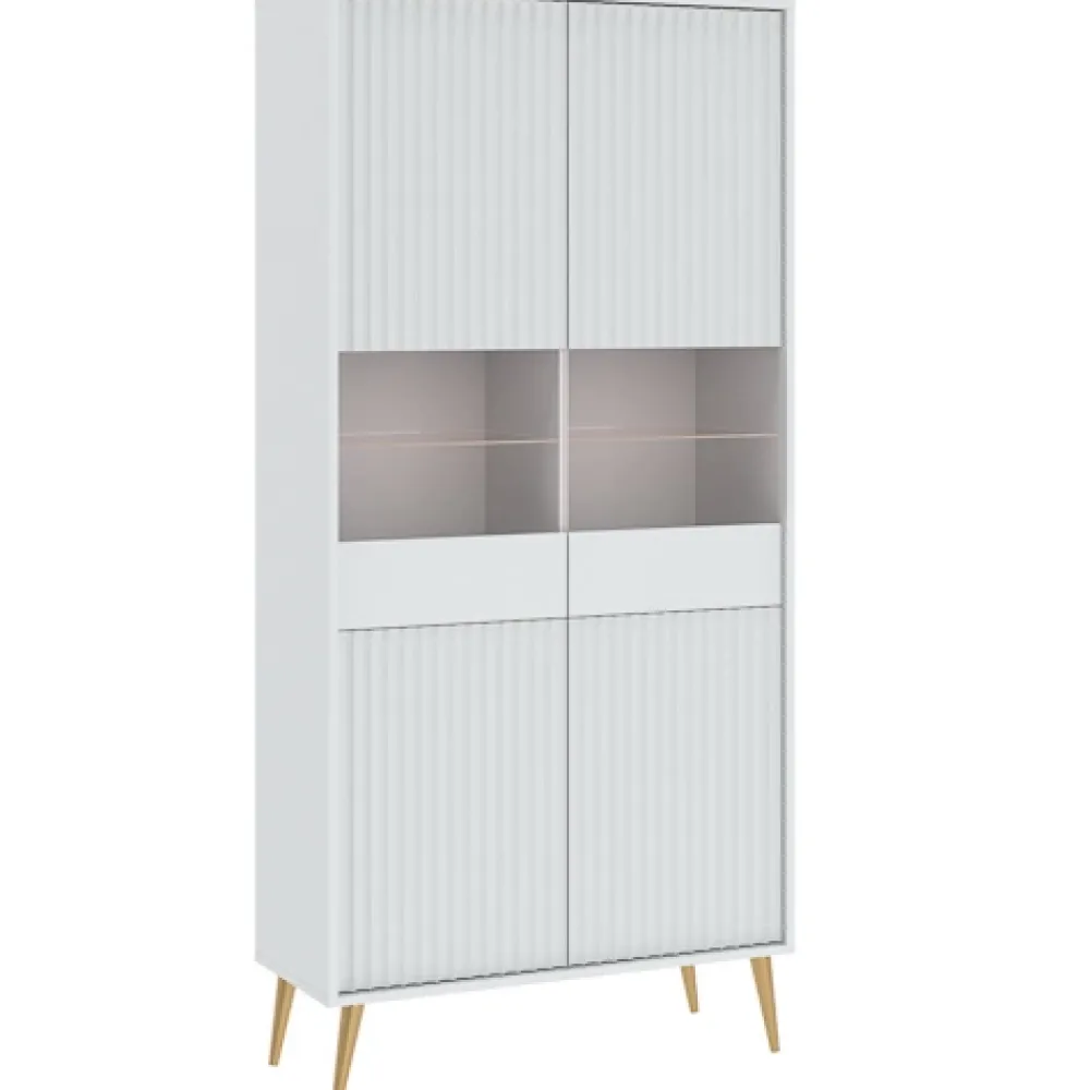 Witryna wysoka BELLUNO w eleganckim kolorze białym to propozycja dla miłośników nowoczesnych i stylowych wnętrz. Ryflowane fronty, matowe wykończenie i minimalistyczna forma sprawiają, że mebel nie tylko przyciąga wzrok, ale też oferuje wyjątkową funkcjonalność. Idealna do salonu, jadalni lub stylowego biura.