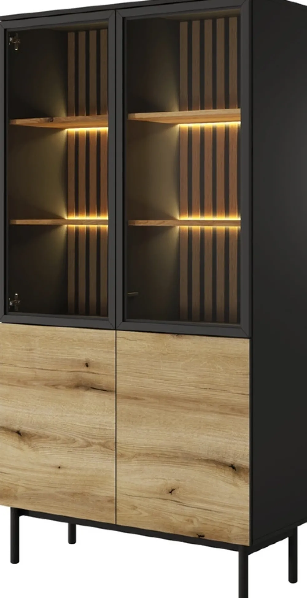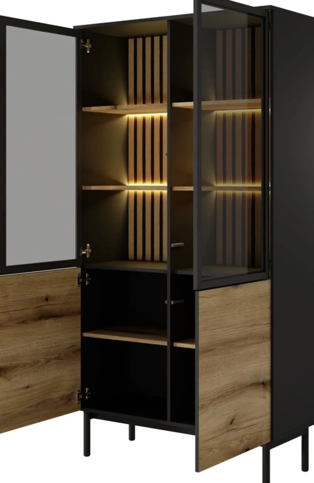 - Witryna do salonu LARINO zaskoczy Cię podświetlanymi półkami, przeszklonymi frontami, a także dużą ilością półek. Witryna na książki wykonana w kolorze czarnym z frontami w kolorze dąb evoke. Mebel stoi na wysokich drewnianych nogach.