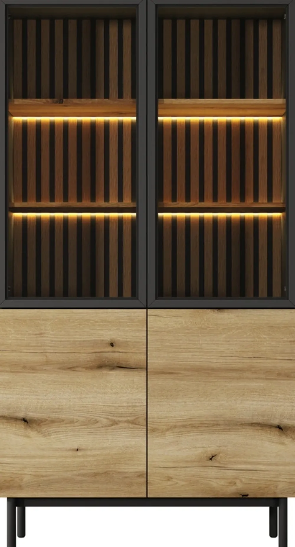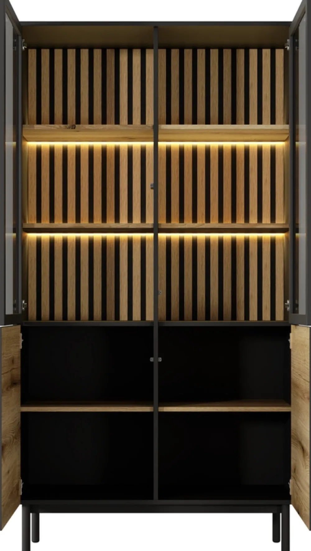 Dodatkowym atutem są eleganckie lamele wewnątrz mebla, które tworzą harmonijną loftową kompozycję. Obrzeża zabezpieczone okleiną ABS zapewniają odporność na uszkodzenia mechaniczne, dzięki czemu witryna na długo zachowuje swój pierwotny wygląd.