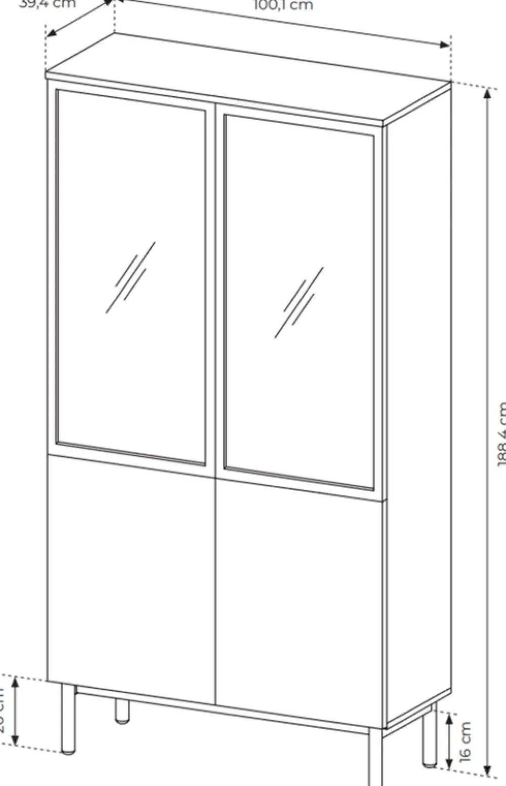 Korpus witryny i fronty (nieprzeszklone) wykonano z 16 mm płyty laminowanej, co gwarantuje trwałość i odporność na codzienne użytkowanie. Natomiast przeszklone fronty, wykonane ze szkła hartowanego pozwolą Ci na eksponowanie ulubionych dekoracji, pamiątek czy zastawy.