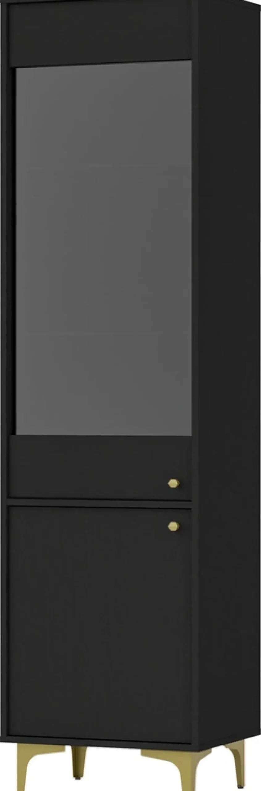 - Witryna do salonu TOKEN została wykonana w czarno – grafitowym kolorze. Złote uchwyty oraz nóżki nadają witrynie nowoczesnych akcentów stylistycznych. Korpus oraz front wykonano z płyty laminowanej 16 mm, obrzeża estetycznie wykończone okleiną ABS.