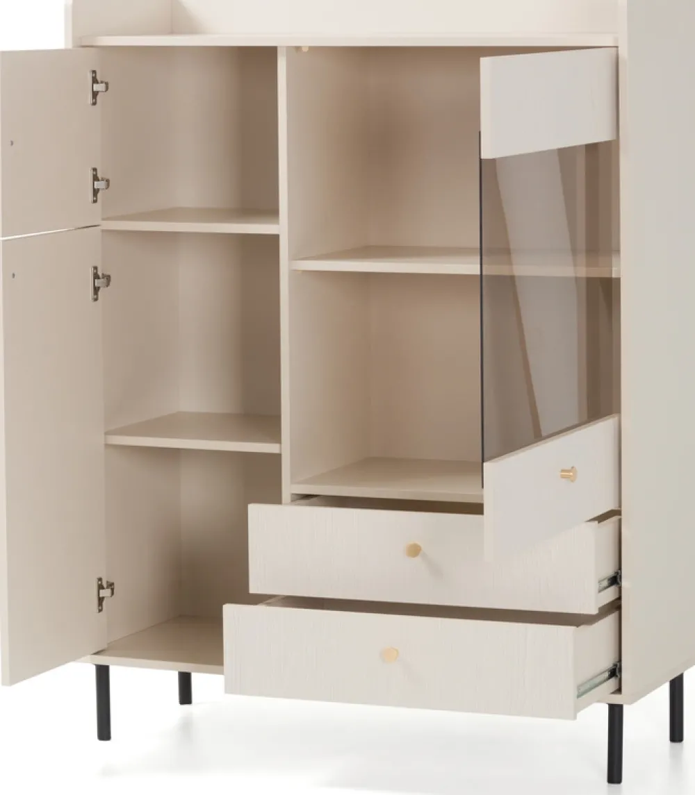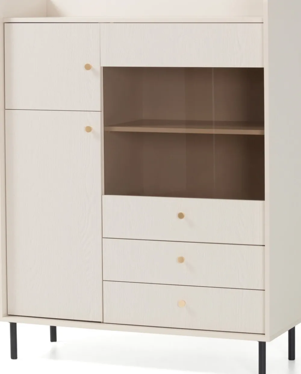 Witryna GAVIA nie tylko pięknie się prezentuje, ale także odpowiada na codzienne potrzeby. Przeszklona część eksponuje ulubione elementy wystroju, a zamykane szafki i szuflady pomagają zachować porządek. Całość utrzymana jest w harmonii nowoczesnego minimalizmu i naturalnych inspiracji.