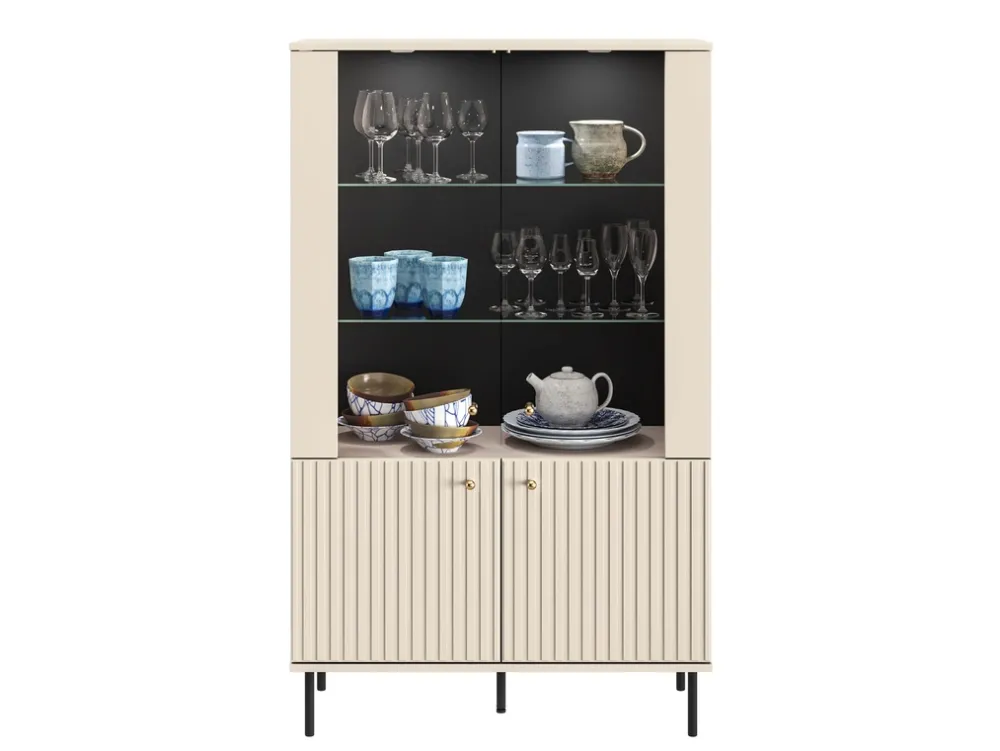 Stabilność i nowoczesny wygląd zapewniają nóżki wykonane z metalu w kolorze czarnym. Wnętrze witryny oferuje trzy półki, z czego dwie wykonane są ze szkła hartowanego, co dodaje lekkości i elegancji. Szklane półki doskonale eksponują przechowywane przedmioty, a oświetlenie w zestawie podkreśla ich walory, tworząc przytulną atmosferę w pomieszczeniu.