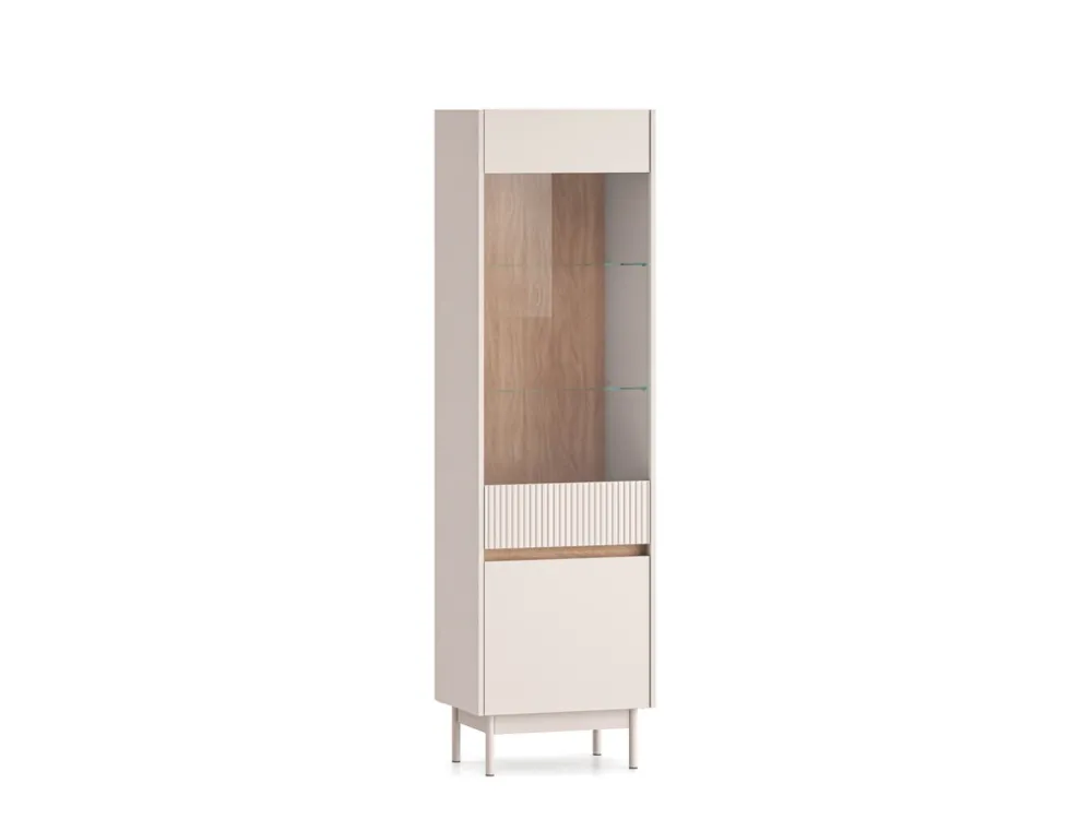 - Witryna DESSO łączy kaszmirowy front z dekorem Dąb Cremona. Przeszklona góra i zamykana dolna szafka zapewniają miejsce na ekspozycję i przechowywanie. Metalowe nóżki i opcjonalne podświetlenie LED dodają lekkości i elegancji każdemu wnętrzu.